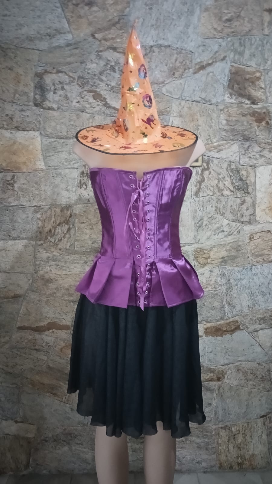 Fantasia de bruxa composta por corpete ajustável, saia e chapéu.